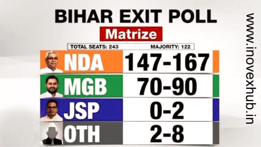Posted onNovember 12, 2025November 12, 2025inNews Bihar Exit Poll 2025: NDA को भारी बहुमत का अनुमान, महागठबंधन को झटका – जानें पूरा एग्जिट पोल रिपोर्ट