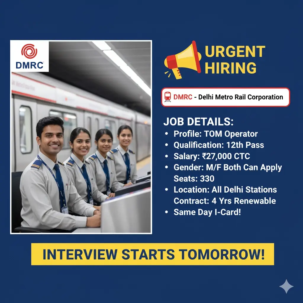 Posted onNovember 2, 2025November 3, 2025inHome दिल्ली मेट्रो में निकली 12वीं पास के लिए सीधी भर्ती, ₹27,000 सैलरी और इंटरव्यू कल से शुरू!